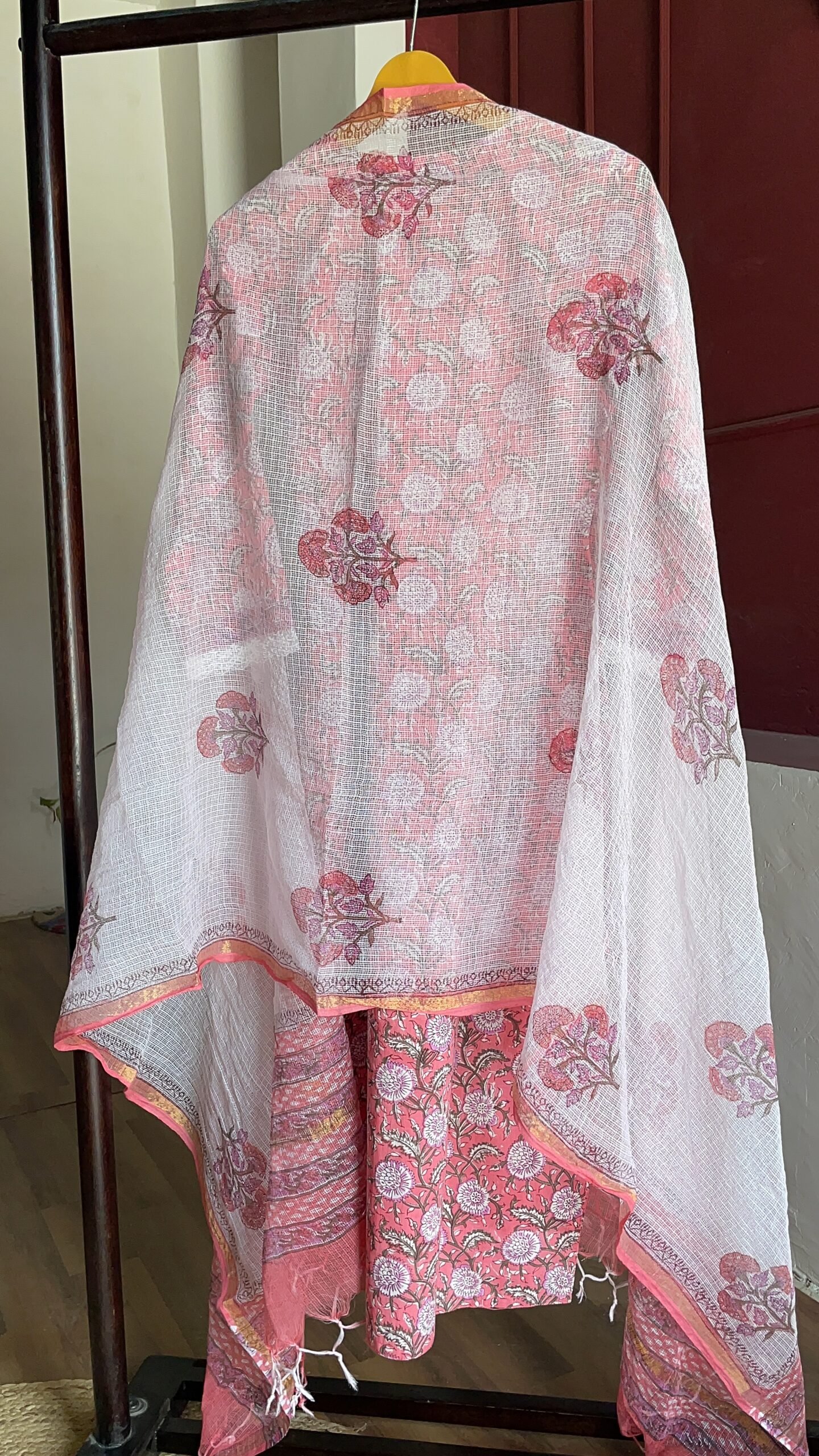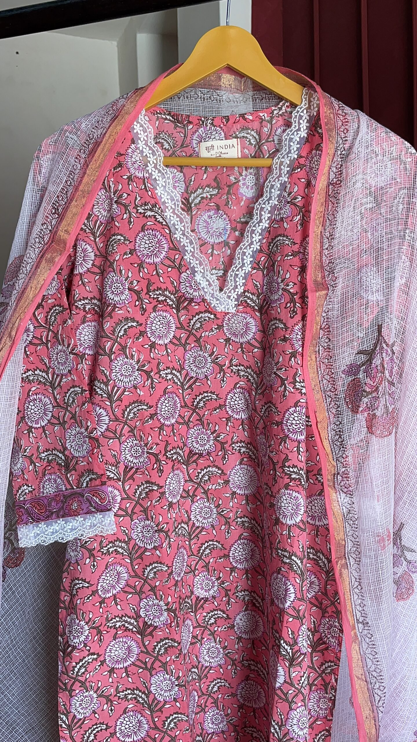 An elegant pink floral handblock printed suit set featuring fine lace detailing on the neckline and sleeves for a refined touch. The soft, breathable cotton kurta is paired with a lightweight Kota Doriya dupatta adorned with floral butis and a delicate border. A graceful ensemble that blends tradition with elegance.