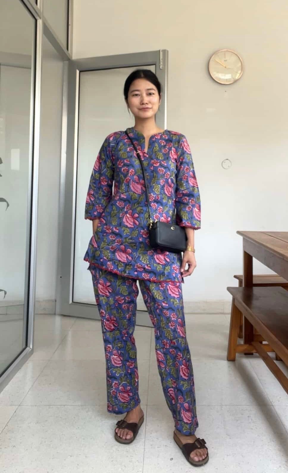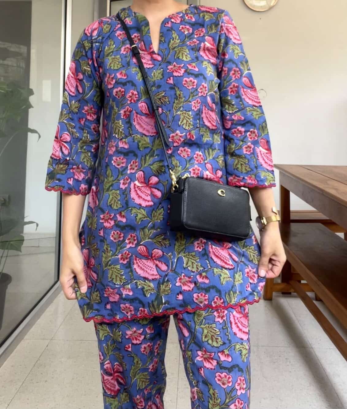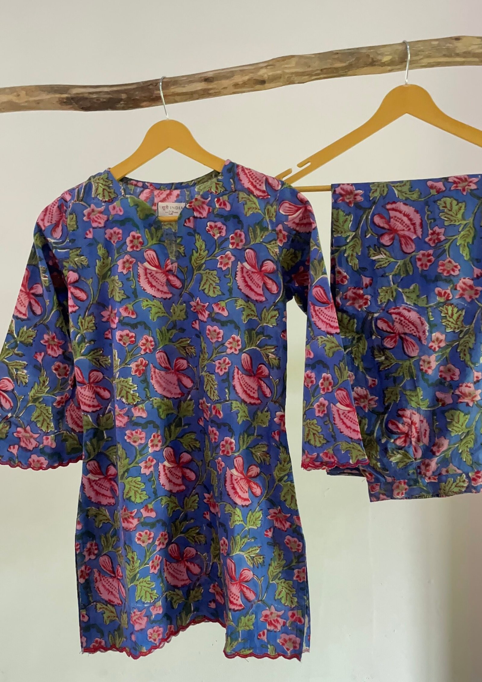Step into effortless elegance with this handcrafted coord set featuring a bold floral handblock print on a vibrant indigo base. Made from soft, breathable cotton, this set combines traditional craftsmanship with a modern silhouette, perfect for day-to- evening wear. The kurta is adorned with large floral motifs in shades Of rose pink, green, and hints Of crimson, creating a striking contrast against the deep blue backdrop. Delicate scallop detailing along the sleeves and hem adds a playful, feminine finish to the design. Paired with a matching printed bottom, this coord set is a celebration of color, comfort, and timeless Indian artistry.