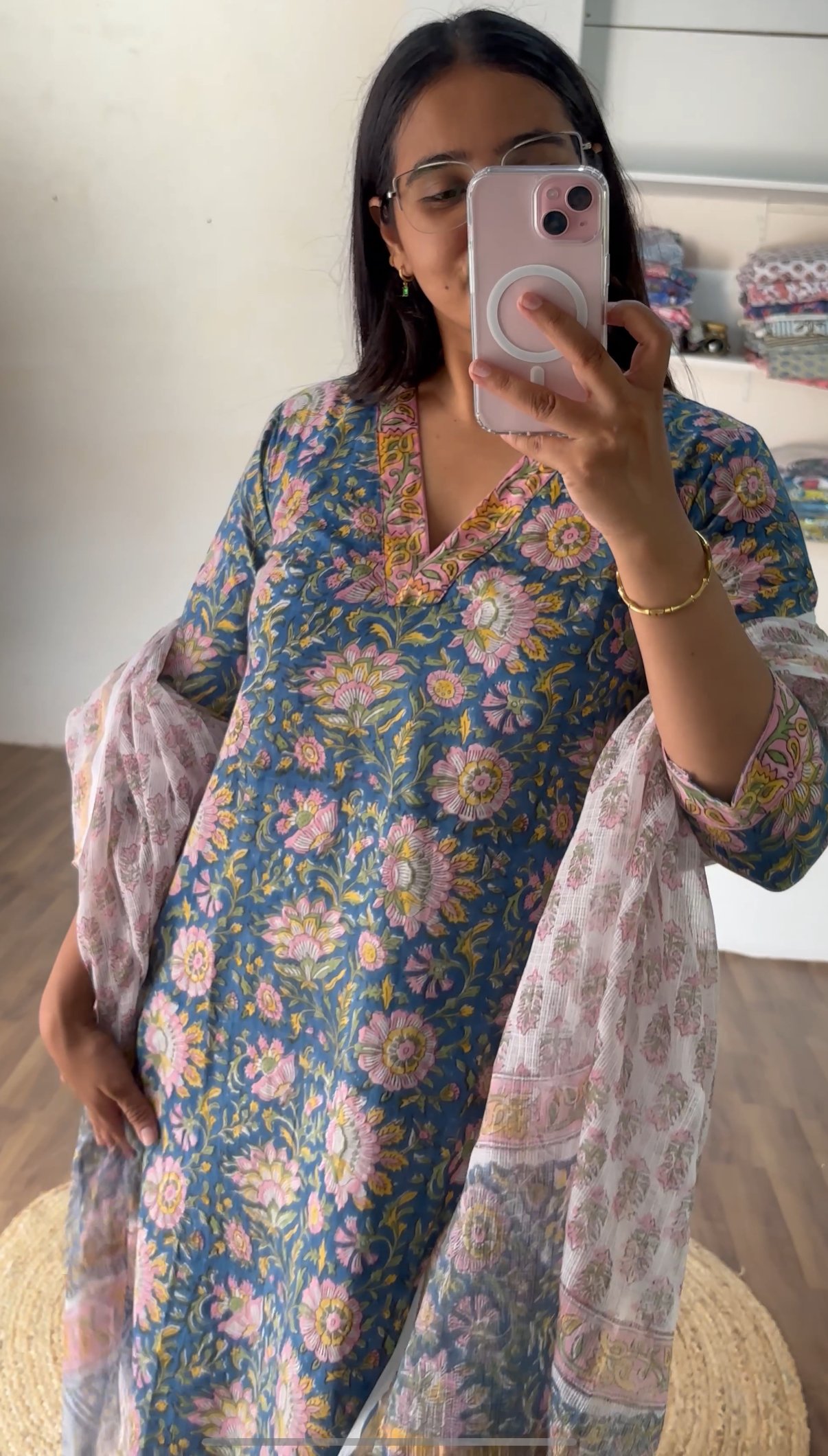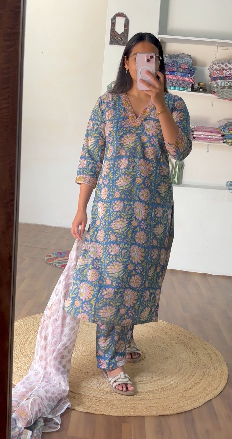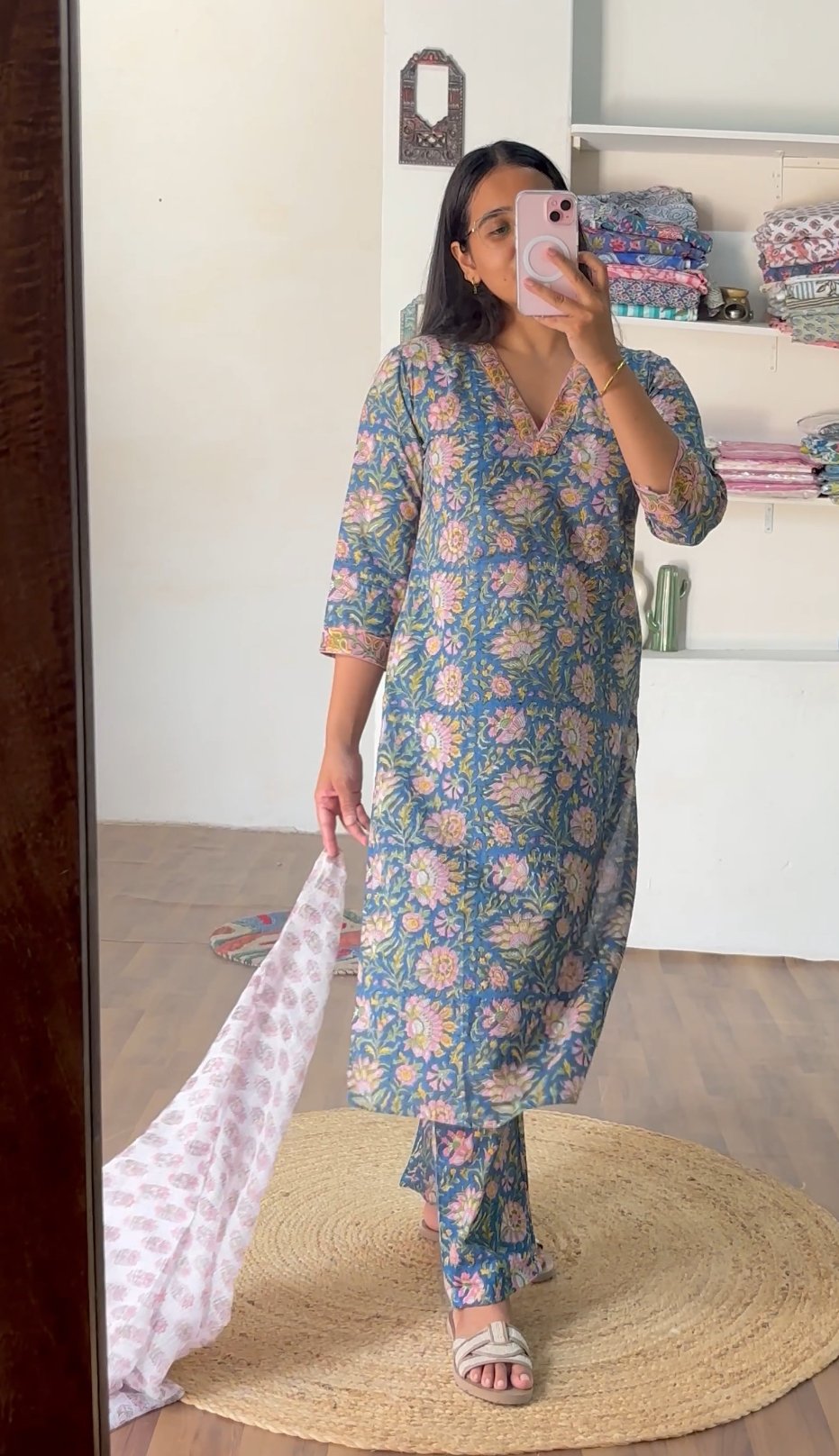 Step into timeless elegance with Our Neelkamal Handblock Cotton Kurta Set, a celebration of traditional craft and everyday comfort. This three-piece set features a straight-cut kurta adorned with intricate floral handblock prints in hues of pink, white, and mustard against a rich teal-blue base. The V-neckline and sleeve cuffs are beautifully detailed with a contrasting pink floral border, adding a refined touch. Paired with matching straight pants and a soft kota doriya dupatta in a complementary floral print, this ensemble is perfect for daily wear, festive gatherings, or a breezy day out. Lightweight, breathable, and effortlessly stylish,Neelkamal brings artisanal charm into your wardrobe.